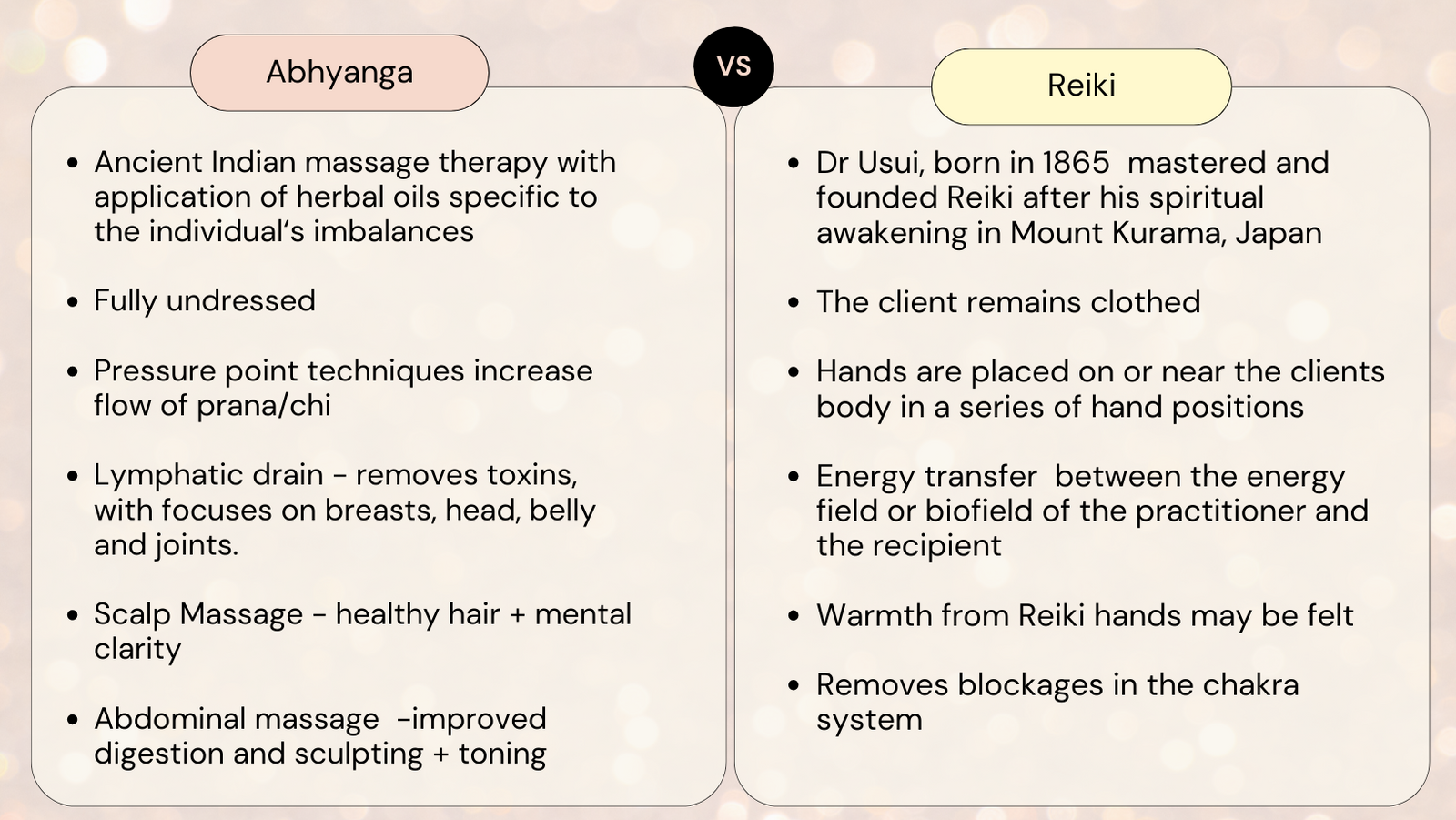 Though the two treatments are different, they do have some similarities. Both are rooted in the relaxation response which often occurs shortly after beginning either Reiki or Ayurvedic massage. Clients typically feel a greater sense of balance and tranquility after either treatment.